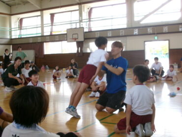 はじめに、親子ペアになり準備運動をしました。親子で体をほぐすストレッチや、子供がまっすぐにたおれて大人が子供を支える、体幹を鍛える運動などを行いました。
