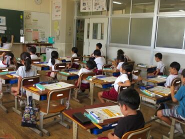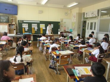 子供たちは、ワークシートの絵から10のまとまりを見付けて楽しそうに〇で囲んでいました。教育実習の先生にも教えてもらったり助けてもらったりしながら取り組んでいました。数の数え方、読み方、かき方はマスターできたかな?