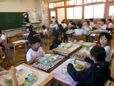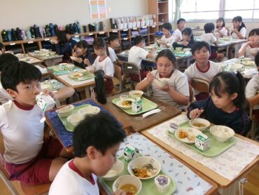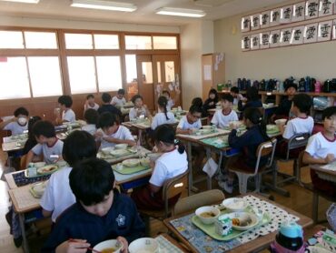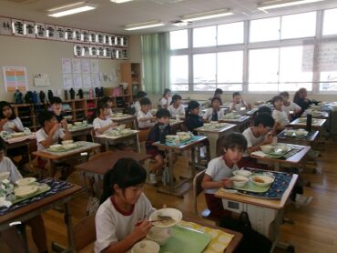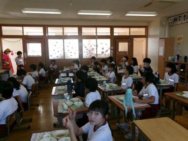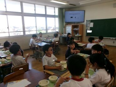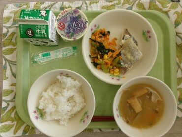 今日は目の愛護デー献立でした。メニューは、ご飯、牛乳、しいらのマヨネーズ焼き、人参しりしり、カボチャの味噌汁、ブルーベリーゼリーです。