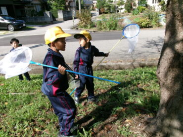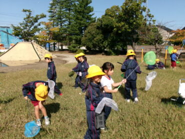 昨日の雨で地面がぬかるんでいるところもありましたが、子供たちは虫を捕まえるために元気よく走り回っていました。「コオロギ2ひきつかまえたよ!」「見て見て!でっかいバッタがおる!」と言いながら友達と協力してコオロギやバッタ、トンボ、カマキリなどを捕まえていました。ドングリを見つけて、たくさん拾っている子供もいました。来月は、ファミリーパークへ行きます。楽しみですね。