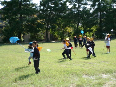 昨日の雨で地面がぬかるんでいるところもありましたが、子供たちは虫を捕まえるために元気よく走り回っていました。「コオロギ2ひきつかまえたよ!」「見て見て!でっかいバッタがおる!」と言いながら友達と協力してコオロギやバッタ、トンボ、カマキリなどを捕まえていました。ドングリを見つけて、たくさん拾っている子供もいました。来月は、ファミリーパークへ行きます。楽しみですね。