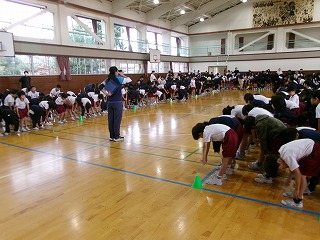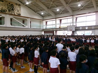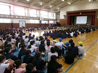 10月の歌声タイムは「ともだち讃歌」を歌いました。キーの高い曲ですが、元気で楽しい歌詞なので、特に高学年は歌うのが難しかったかもしれません。しかし、低学年を中心とした元気な声と、中・高学年の美しい高音が合わさったすてきな歌声が体育館いっぱいに広がりました。
