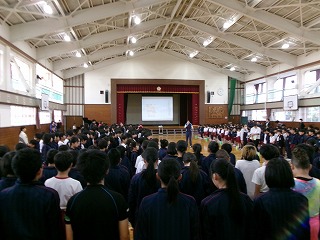 10月の歌声タイムは「ともだち讃歌」を歌いました。キーの高い曲ですが、元気で楽しい歌詞なので、特に高学年は歌うのが難しかったかもしれません。しかし、低学年を中心とした元気な声と、中・高学年の美しい高音が合わさったすてきな歌声が体育館いっぱいに広がりました。