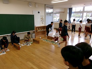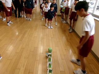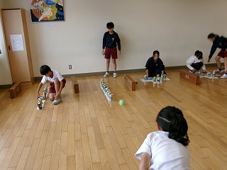 アルミ缶を再利用したピンを、紙で作ったボールで倒すボウリング型ゲームなのですが、通常の並び方の他に、環境美化隊オリジナルの並べ方が難しかったようで、倒せた子供たちは大喜びでした。