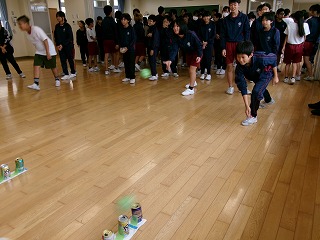 長休みに会議室で環境美化隊が企画した「アルミ缶を倒せ!シューティングゲーム」を行いました。