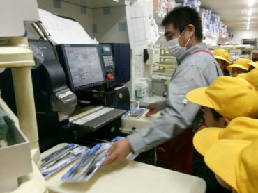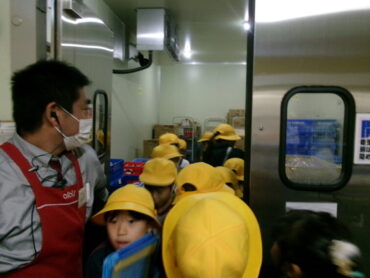 次に、普段は見ることのできないバックヤードを見学させてもらいました。パソコンで操作して値札を印刷するところや、新鮮な魚を機械を使って自動でパック詰めするところなどを見せていただきました。さらに、大きな冷蔵室に入って、中の5℃の温度を体感させてもらったりもしました。