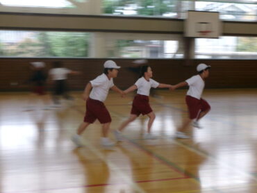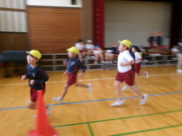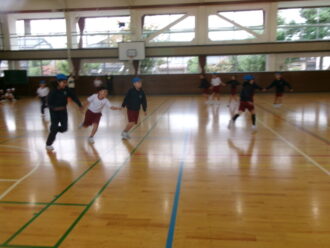今日は持久走の記録をとる予定でしたが、あいにくの雨だったため、体育館で手つなぎおにや4分間走を行いました。