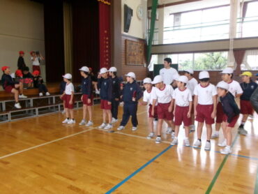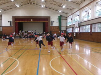 今日は持久走の記録をとる予定でしたが、あいにくの雨だったため、体育館で手つなぎおにや4分間走を行いました。