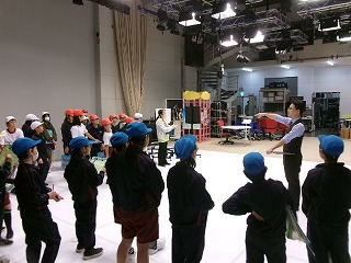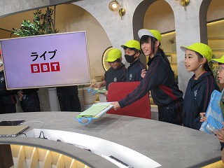 富山テレビ放送では、地元の人に向けた番組づくりの工夫やテレビ局内の設備、人前で情報を伝えるときに大切なこと等を学びました。普段テレビの中で見かけるアナウンサーさんやキャラクターを間近に見ることができました。学校に帰るときには、呉羽山の頂上にあるテレビアンテナも確認することができました。