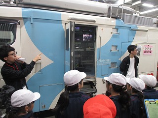 富山テレビ放送では、地元の人に向けた番組づくりの工夫やテレビ局内の設備、人前で情報を伝えるときに大切なこと等を学びました。普段テレビの中で見かけるアナウンサーさんやキャラクターを間近に見ることができました。学校に帰るときには、呉羽山の頂上にあるテレビアンテナも確認することができました。