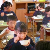 今年は旧高岡市と旧福岡町が合併し、新しい高岡市が誕生してから20周年を迎えます。今日の献立は、それを記念した献立になっています。今日のメニューは、ご飯、牛乳、里芋ハンバーグ、高岡野菜のごまあえ、高岡つくりもん汁、お祝いゼリーでした。