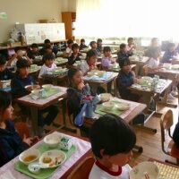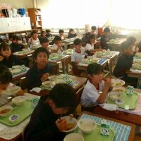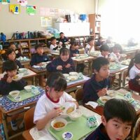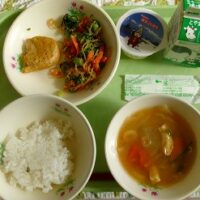 今年は旧高岡市と旧福岡町が合併し、新しい高岡市が誕生してから20周年を迎えます。今日の献立は、それを記念した献立になっています。今日のメニューは、ご飯、牛乳、里芋ハンバーグ、高岡野菜のごまあえ、高岡つくりもん汁、お祝いゼリーでした。