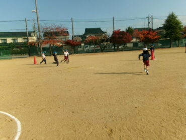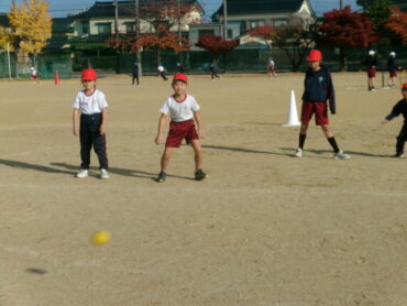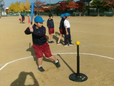 10月から、晴れた日は体育の時間にティーボールの練習をしてきました。はじめは、2人ペアになりボールを投げたりキャッチしたりする練習から始まりました。次に、2チームに分かれてバッティングティーに置かれた止まったボールを打つチームと、ボールを捕るチームに分かれて打つ・捕る練習をしました。そして、今日はボールを打って走る「三角ベースティーボール」を練習しました。