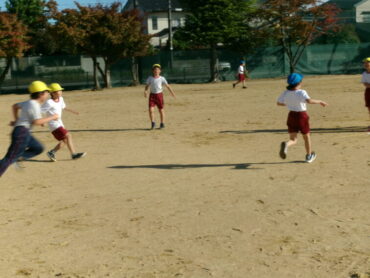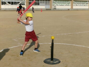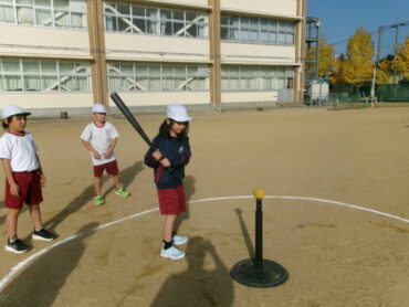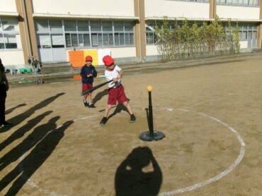 10月から、晴れた日は体育の時間にティーボールの練習をしてきました。はじめは、2人ペアになりボールを投げたりキャッチしたりする練習から始まりました。次に、2チームに分かれてバッティングティーに置かれた止まったボールを打つチームと、ボールを捕るチームに分かれて打つ・捕る練習をしました。そして、今日はボールを打って走る「三角ベースティーボール」を練習しました。