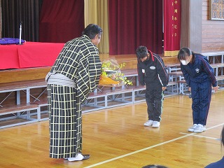 牧野っ子が落語に親しむ機会になり、「生活に笑いを」というテーマでお話もしていただきました。初めて生で落語を視聴した子供たちのために、落語の楽しみ方も教えていもらいました。