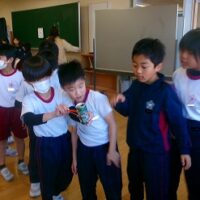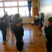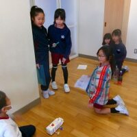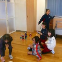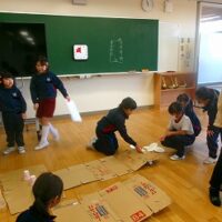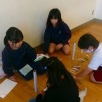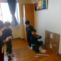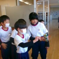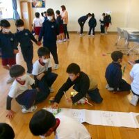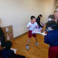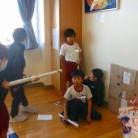 2年生は生活科の時間に、牛乳パックやトイレットペーパー等、身の回りの材料を使っておもちゃをつくりました。そして、1年生を招待して一緒に遊びたいと考えています。そこで今回は、2年生の違うクラスの友達を呼んで、おもちゃランドのおためしをしてみました。