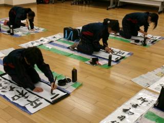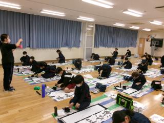 5年生は書初練習を始めました。先日から道具や手本を準備してきましたが、いよいよ今日から書き始めます。いつもの書写とは違い、だるま筆で大きな条幅の紙に「平和な海」という文字を書きます。
