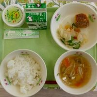 今日は郷土食献立の日でした。メニューは、揚げ出し豆腐のごまだれがけ、かぶの色とり、豚汁、青りんごゼリー、ご飯、牛乳でした。