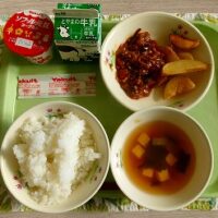 今日は、毎月19日のお楽しみ「たかおか食19(いく)丼献立」の日でした。メニューは、高岡野菜の肉みそ丼、ポテト、わかめのすまし汁、ヨーグルト、牛乳、ご飯でした。今日の食19丼に入っている高岡産の野菜は、大根と生椎茸です。