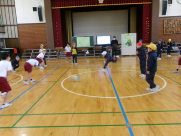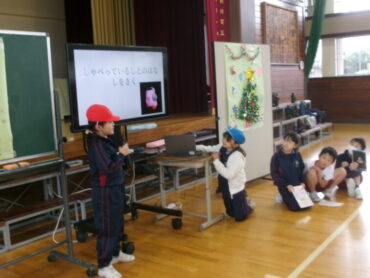 総合司会の進行ではじめの言葉の後は、ダンシングおにごっこやクイズ、ドッジボール、猛獣がりゲームなどを行いました。自分たちで作成したスライドをテレビモニターに映し出し、ルールや手順を説明するなど、楽しく安全にお楽しみ会を進めることができました。