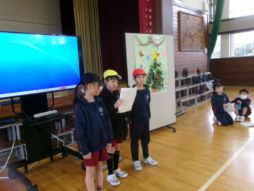 3年生全体で、2学期最後のお楽しみ会を行いました。今回は2組が主催で、子供たちで企画・進行を行いました。かざりをつくったりせりふの練習をしたり、それぞれの会社で工夫して出し物を準備してきました。