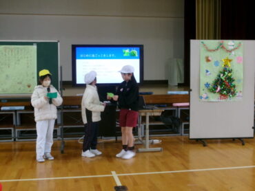 3年生全体で、2学期最後のお楽しみ会を行いました。今回は2組が主催で、子供たちで企画・進行を行いました。かざりをつくったりせりふの練習をしたり、それぞれの会社で工夫して出し物を準備してきました。