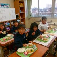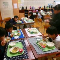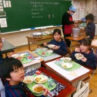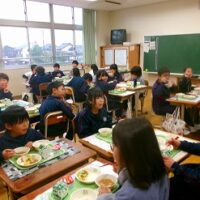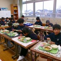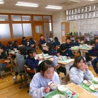 今日の献立は、ご飯、牛乳、豚肉としらたきのピリから炒め、そくせき漬け、だんご汁、ヨーグルトでした。だんご汁に入っていただんごは、普段ごはんとして食べている「うるち米」が原料です。うるち米をくだいて粉にしたものに、水を加えて丸め、ゆでたり蒸したりしてつくられています。ちなみにもちは、「もち米」を米つぶのまま蒸して、うすやきね等でつぶしてつくられています。