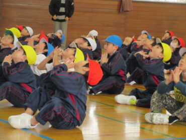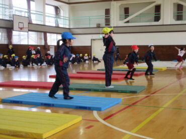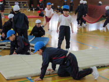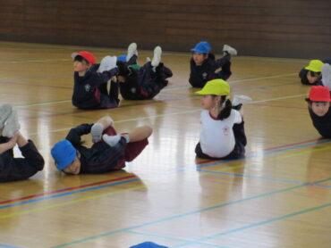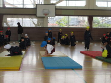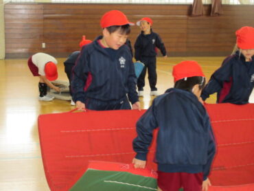 1年生は、体育でマット運動をがんばっています。寒いのでしっかり準備体操をした後、両手両ひざつき側転や、側転に挑戦しました。
