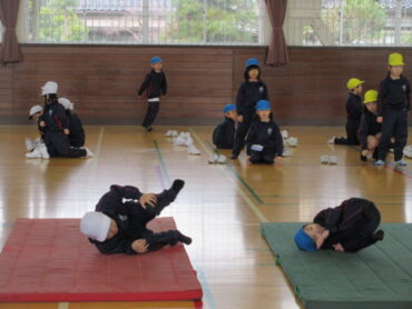 初めての動きに不安そうな子供たちでしたが、お手本を見た後やってみると、「できた!」「転がれたよ!」と嬉しそうでした。最後は手を挙げ、ポーズを決めます。