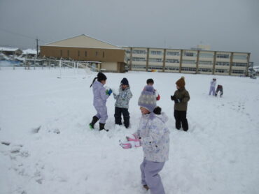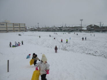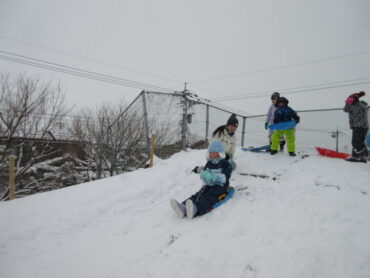 雪だるまをつくったり、雪合戦をしたり、広いグラウンドで思いっきり遊ぶことができました。築山でそりをして遊んだ子供たちは「めっちゃ楽しい!!」「すごいスピードや」と大興奮。大満足でした。