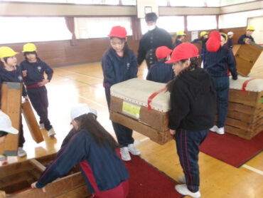 3年生の体育では、先週から跳び箱の学習をしています。準備運動の後、跳び箱、踏切板、マットなどを協力しながら運びました。安全に気を付けながら皆で準備したり片付けたりすることも、だんだん上手になってきました。