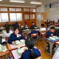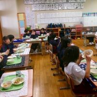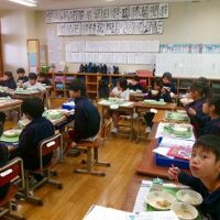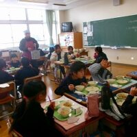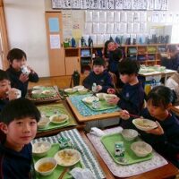 今日の給食は「地場産献立」でした。メニューは、ご飯、牛乳、豚肉のジャンロー、しそあえ、高岡野菜のあったか汁、干しプルーンです。高岡産の野菜がたっぷり使われています。玉ねぎは甘く、汁物には大根やニンジンの他にサトイモもたっぷり入って体が温まりました。