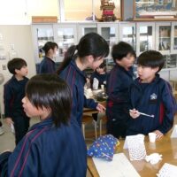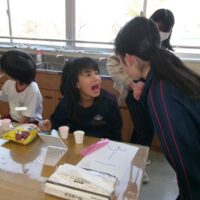 黒板には「①こまかくみがこう ②ながくみがこう ③やさしいちからでみがこう」と表示してあり、鏡をよく見ながら給食を食べた後のよごれを落としていました。
