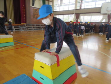 1年生は体育の学習で跳び箱運動に挑戦しています。「ドン!パン!ビュン!」のかけ声とともに、両足をそろえて踏み切り、手をしっかり前の方について、おしりを高く上げて跳びます。まだうまく跳べない人は、低い跳び箱で一生懸命練習しています。うまく跳べるようになりたいと、頑張っています!