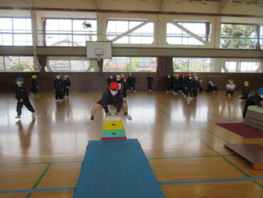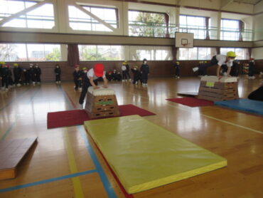 1年生は体育の学習で跳び箱運動に挑戦しています。「ドン!パン!ビュン!」のかけ声とともに、両足をそろえて踏み切り、手をしっかり前の方について、おしりを高く上げて跳びます。まだうまく跳べない人は、低い跳び箱で一生懸命練習しています。うまく跳べるようになりたいと、頑張っています!